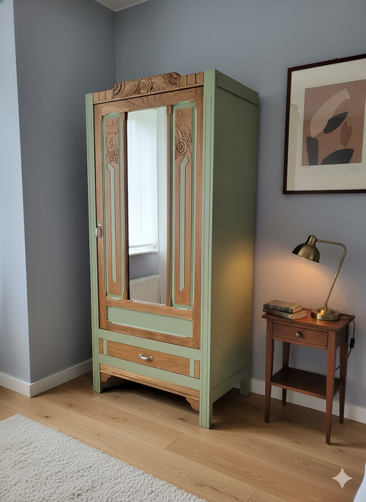 Armoire bonnetière à miroir “Art Déco” en chêne de 1930 personnalisée