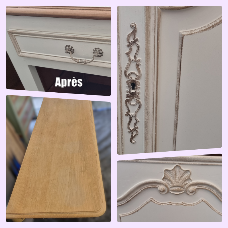 Sa structure a été mise en valeur par une peinture couleur « Lin », réhaussée d’une patine « Marron » qui souligne délicatement les sculptures et reliefs.