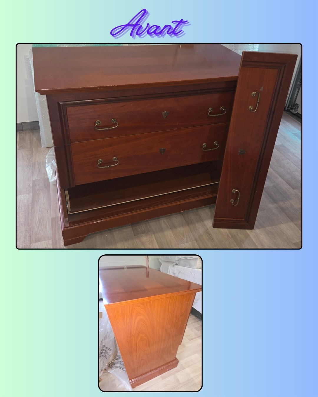 Cette ancienne commode en placage merisier, abîmée par le temps, a retrouvé tout son charme grâce à un relooking soigné et créatif.
