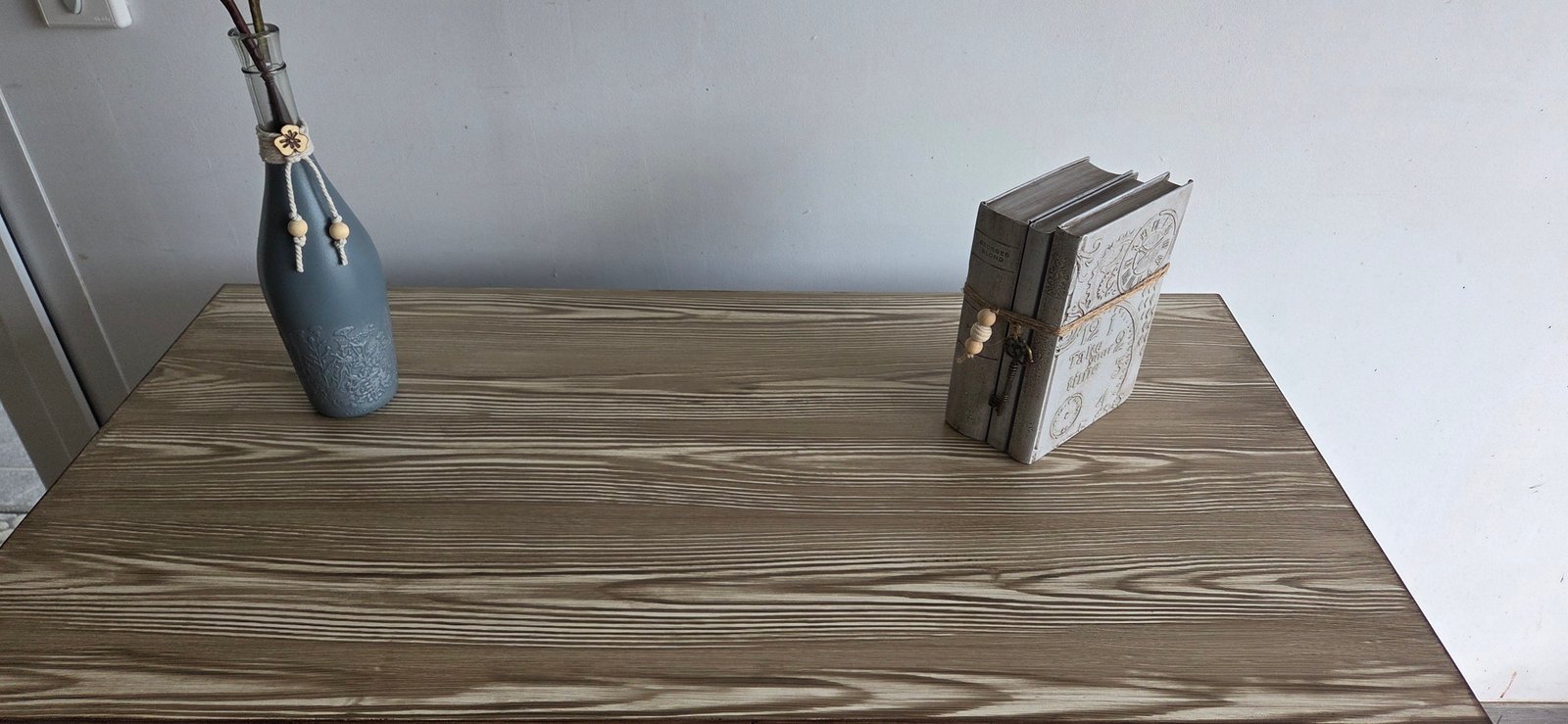 Le plateau, dont le placage ne permettait pas un retour au bois brut, a été transformé en une imitation bois flotté : une peinture à effet bois avec veinage et nœuds dessinés, parfaite alternative pour un rendu naturel et chaleureux.