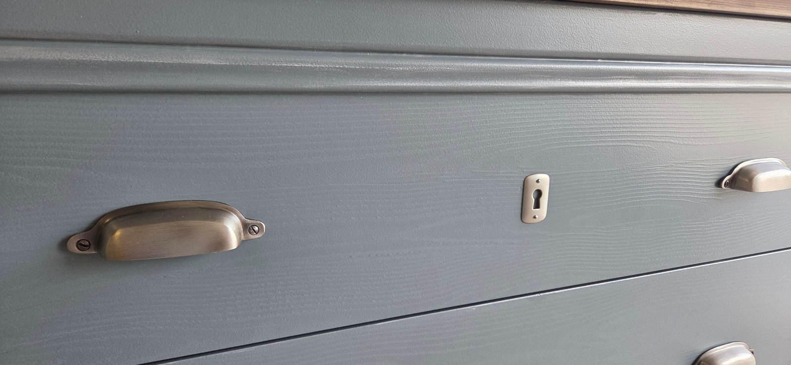 Le corps du meuble a été peint dans un bleu acier profond, rehaussé d’un effet de veinage travaillé à la main, créant un superbe trompe-l’œil qui donne l’illusion d’un bois massif.