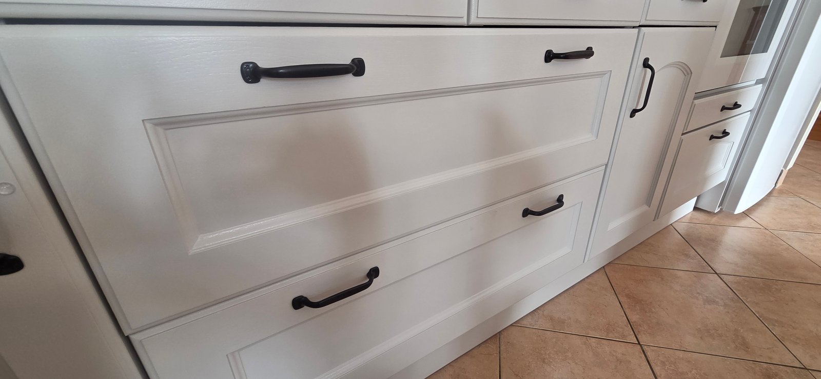 Les meubles ont été repeints dans une douce nuance perle, une couleur intemporelle qui illumine l’espace tout en restant raffinée. Les poignées en métal noir mat remplacent désormais la porcelaine d’origine, insufflant une touche résolument moderne et affirmée, parfaitement en accord avec les tendances actuelles.