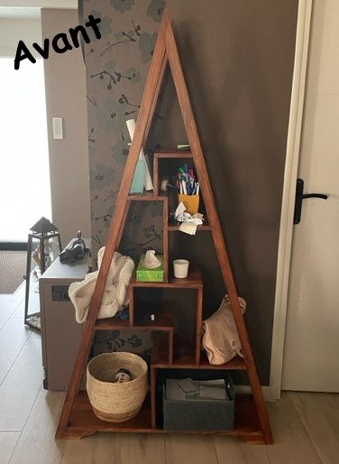Une étagère pyramide en bois exotique a été modernisée : les montants ont été peints en noir pour un effet graphique et élégant, tandis que les étagères ont été habillées d’une peinture effet bois chêne clair, avec imitation des nœuds et du veinage pour conserver un aspect naturel. L’ensemble a été protégé et sublimé par un vitrificateur satiné pour un fini durable et soigné.