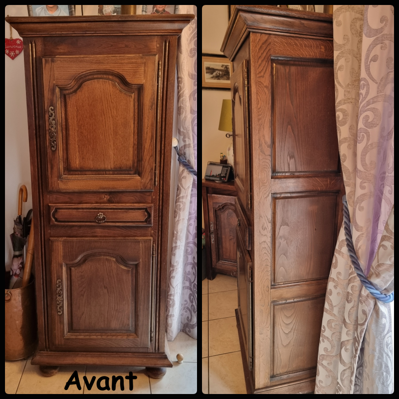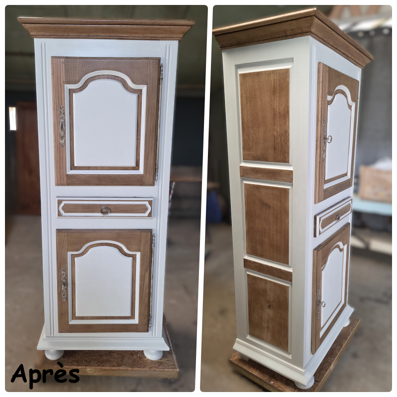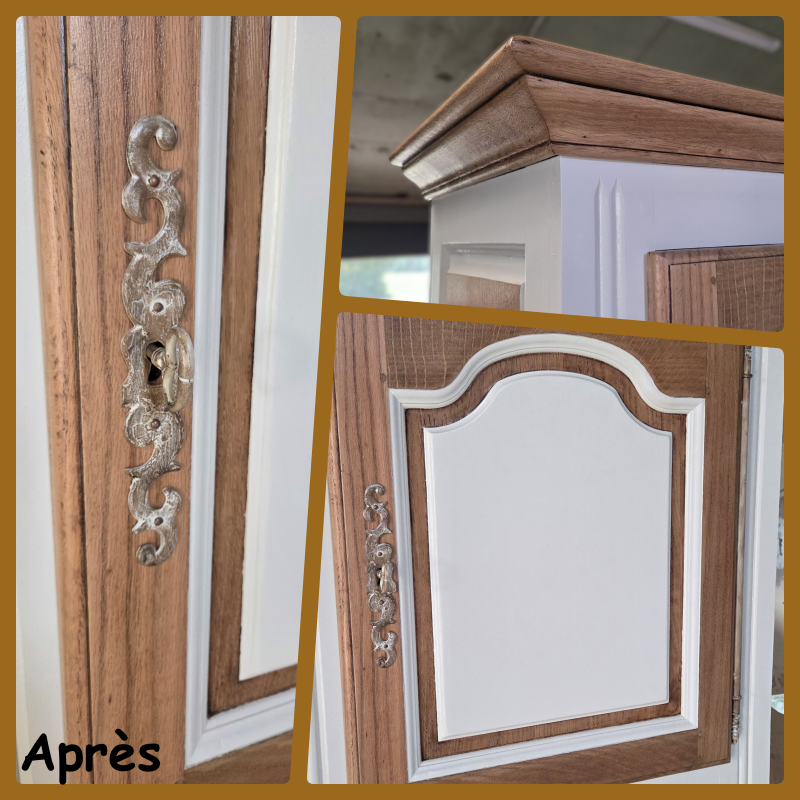 Cet élégant meuble, autrefois en chêne foncé, retrouve aujourd’hui toute sa lumière et son charme grâce à une transformation subtile et raffinée.