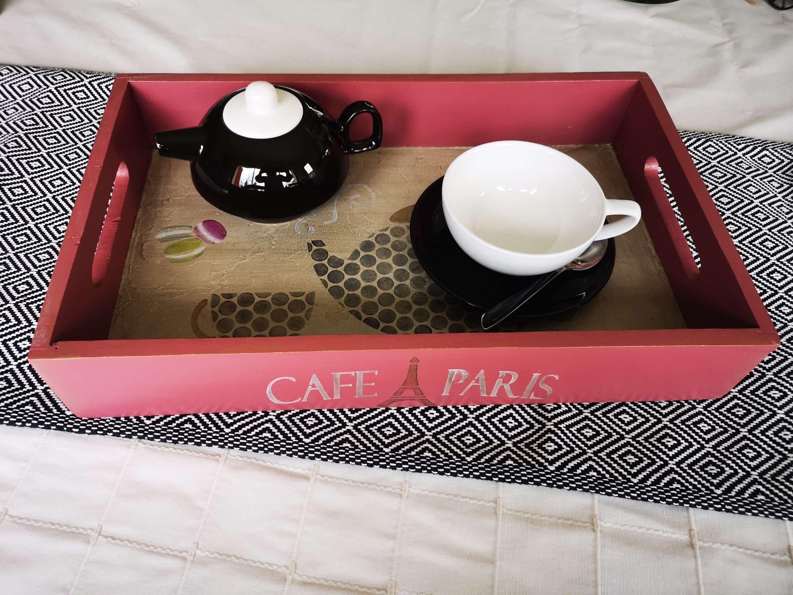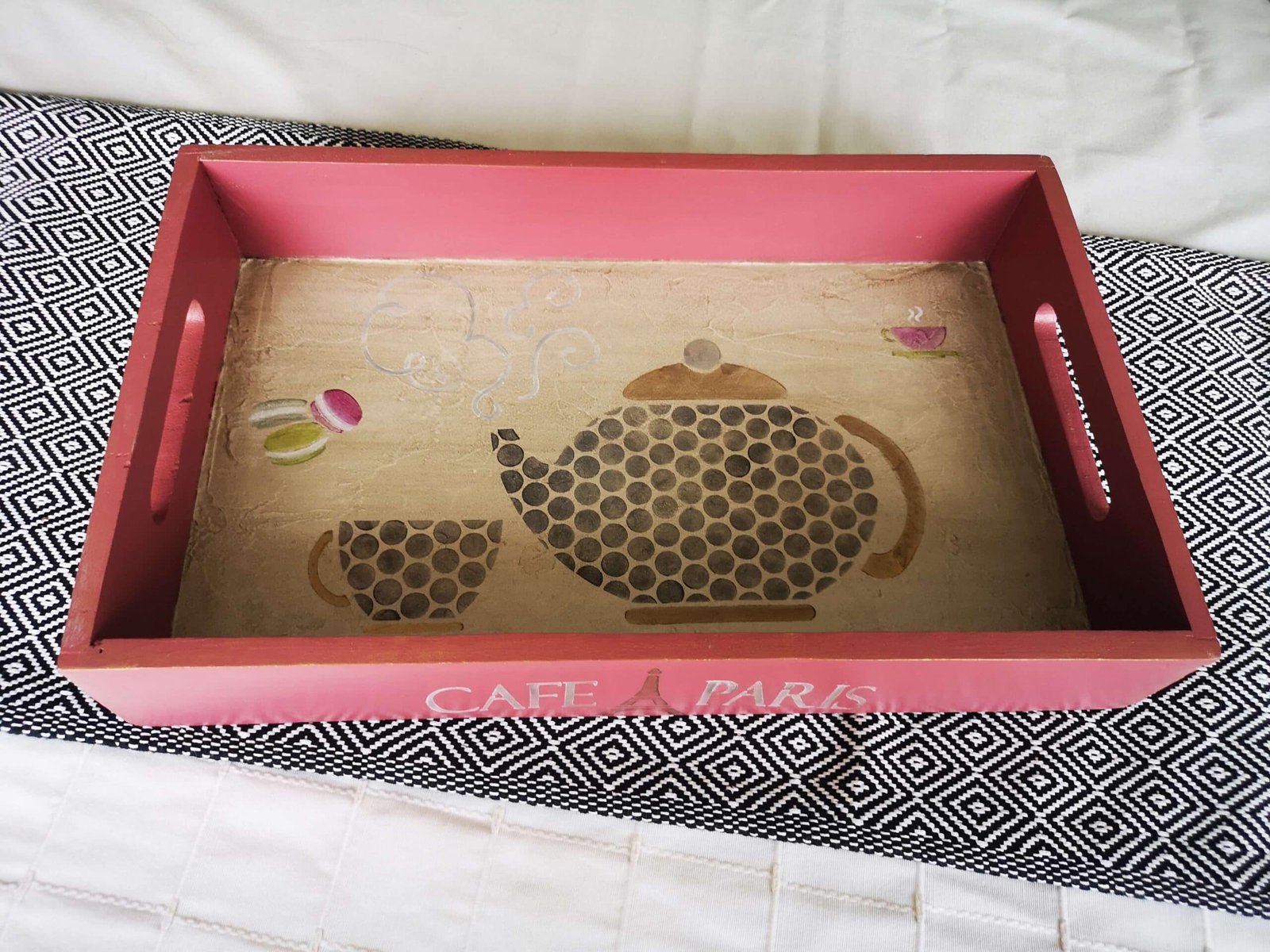 De charmants pochoirs représentant une petite théière et sa tasse ont été peints ainsi que des petits macarons, l’ensemble a été vernis optimisant sa protection.