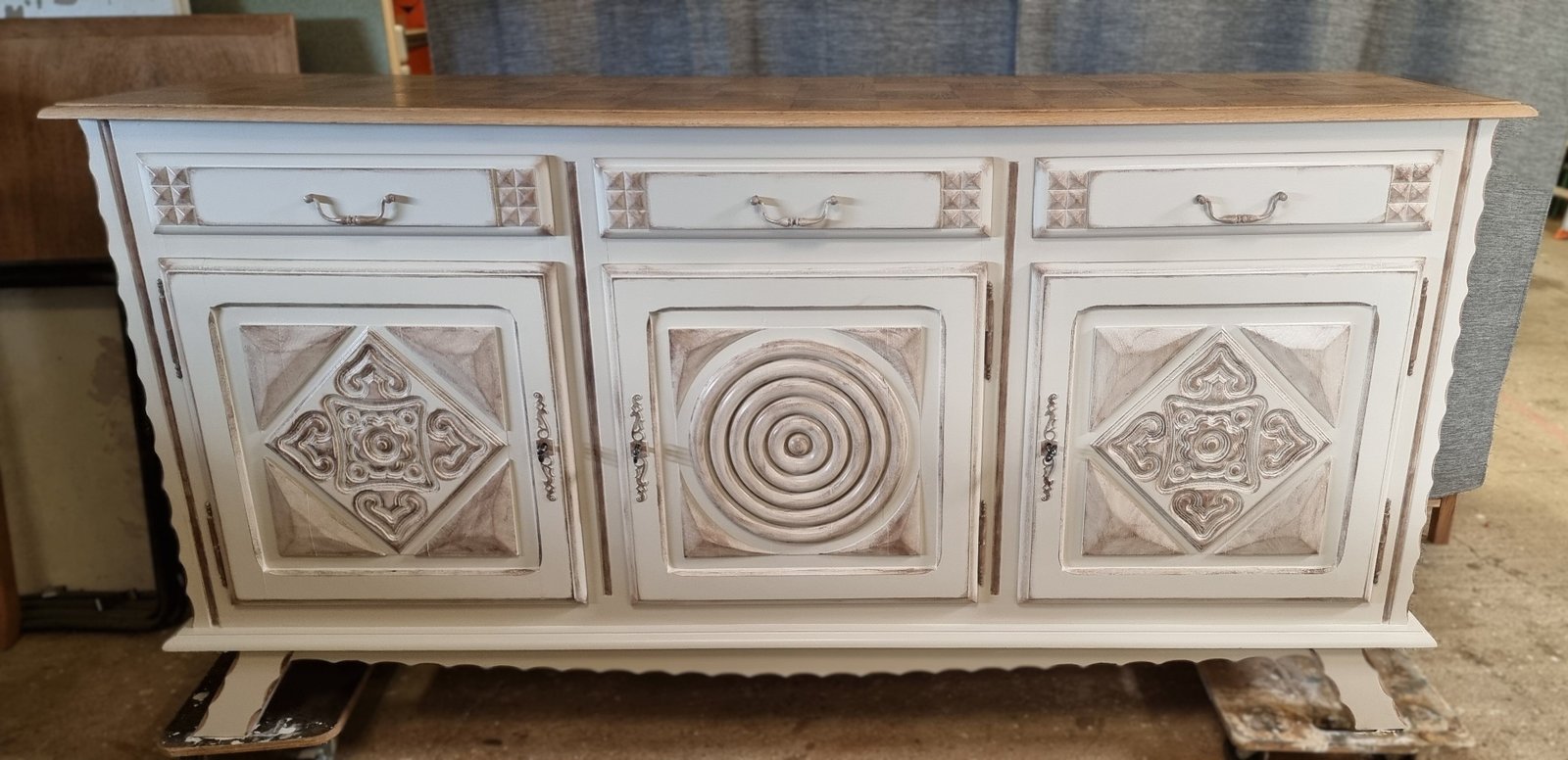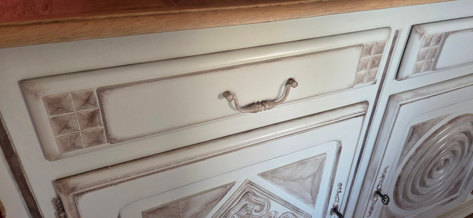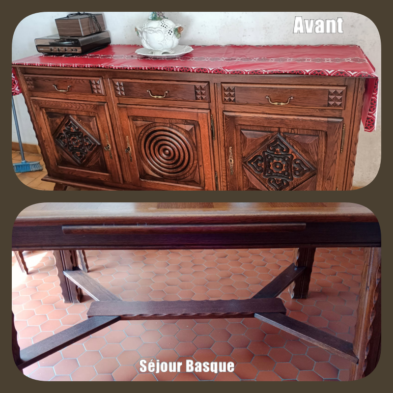Ce séjour basque en chêne massif, composé d’une enfilade et d’une table avec ses deux rallonges, a bénéficié d’un relooking complet mêlant respect du bois et mise en lumière de ses détails.