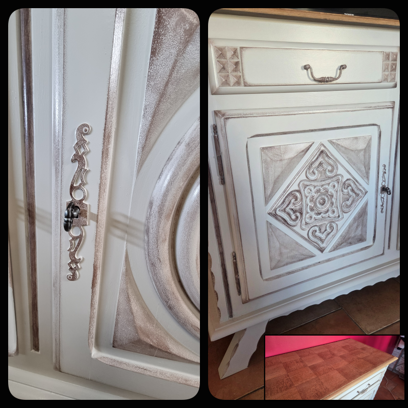 L’ensemble a été peint en teinte soie sauvage, une couleur douce et lumineuse qui modernise le style tout en apportant élégance et clarté. Les reliefs et ornements ont été subtilement travaillés au bâton à huile ombre naturel, ce qui permet de souligner les sculptures et donner de la profondeur sans alourdir l’ensemble.