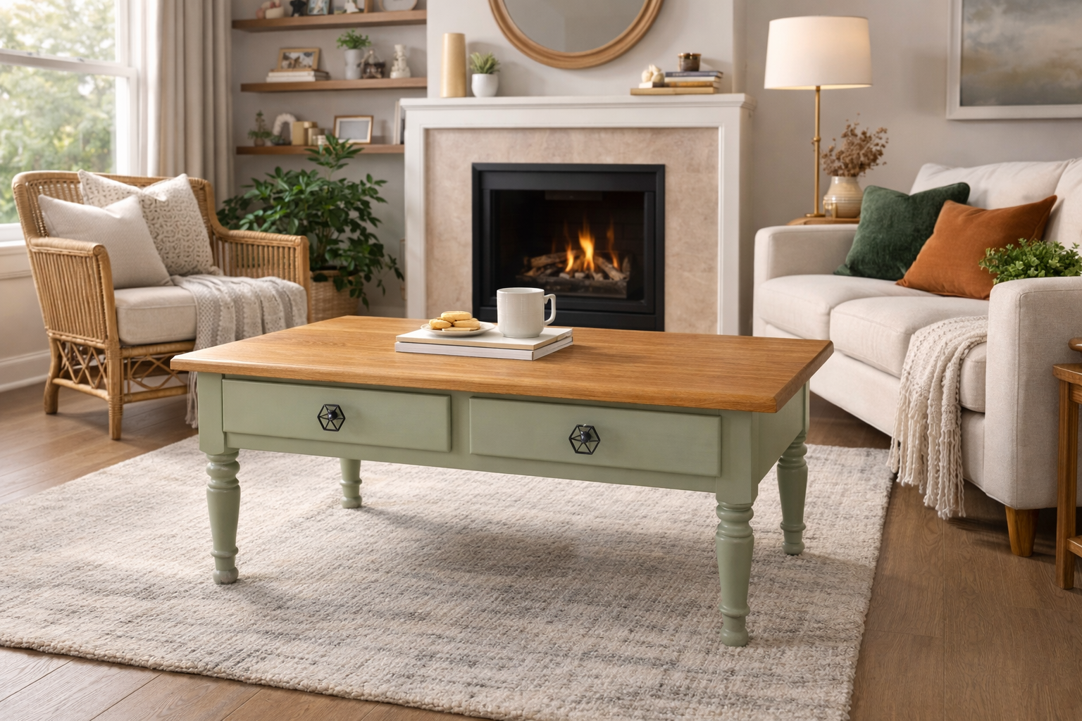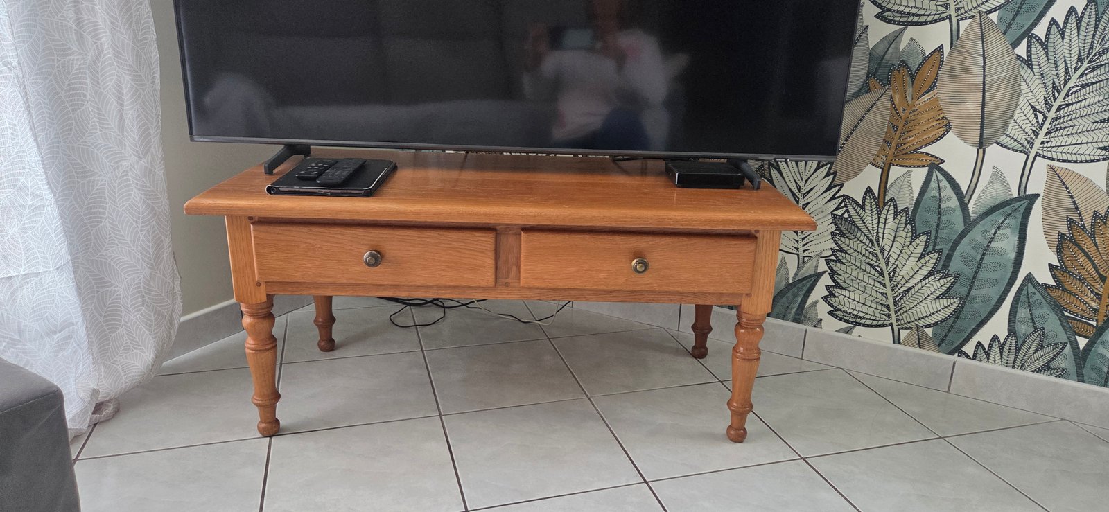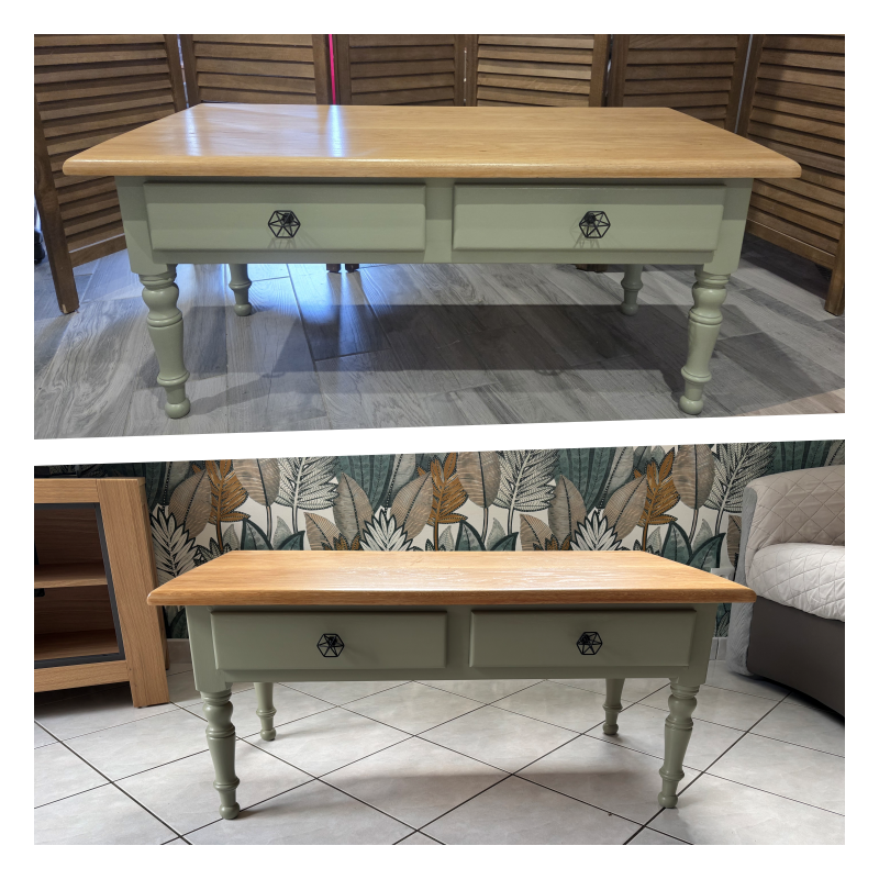 Cette table basse rectangulaire en chêne massif, dotée de deux tiroirs pratiques, a fait l’objet d’un relooking complet afin de lui offrir une seconde vie, plus actuelle et en parfaite harmonie avec son intérieur.