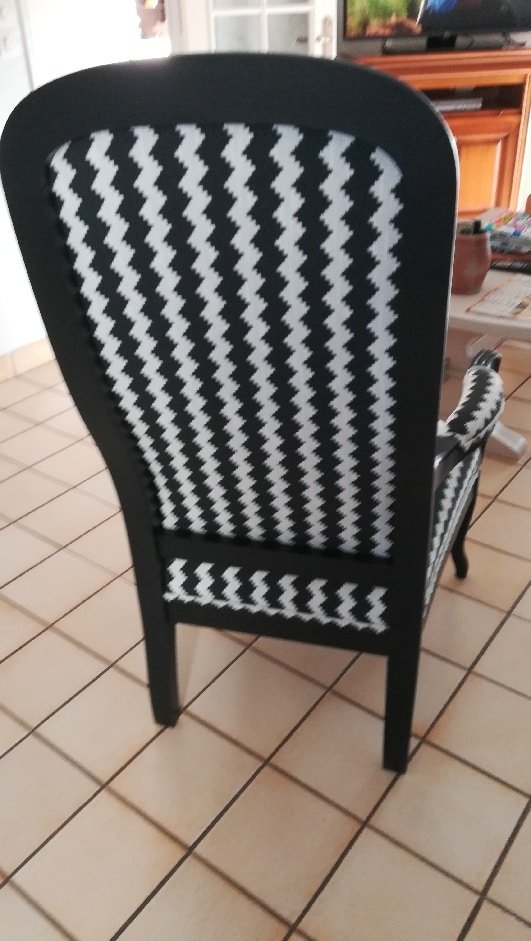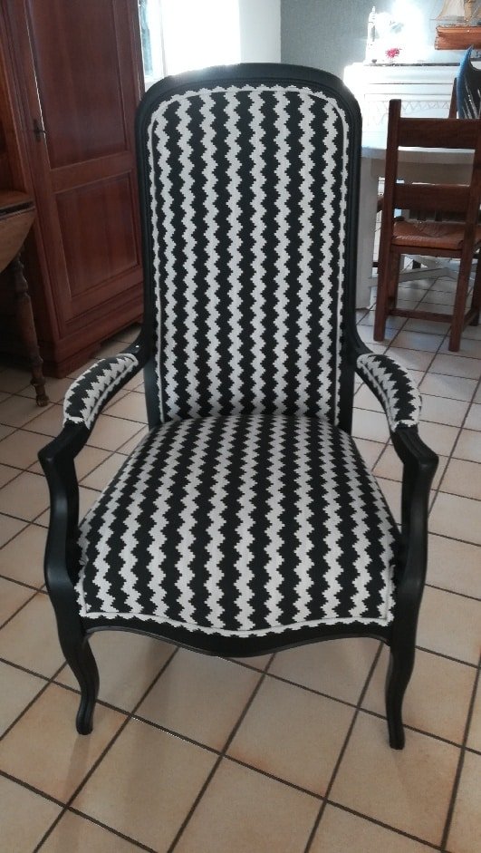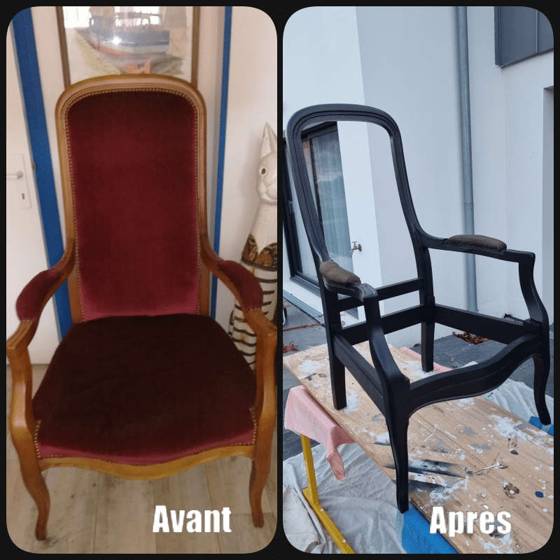 Après avoir était déshabillé de son ancienne garniture, l’ossature a été complétement poncée, pâte à bois pour effacer les trous des clous tapissiers et mise en peinture. Le choix s’est orienté sur le “Noir” et une finition vernis mat.